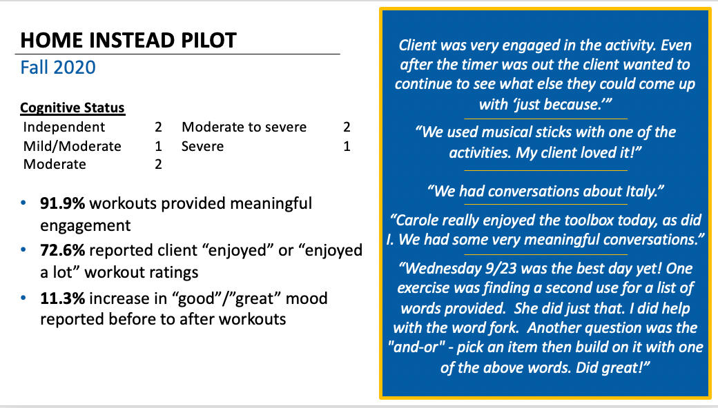 “Being able to hear all the stories and see how happy it made the resident made it all worth it. You really got to see her mood improve.”– Pilot Study Trainer